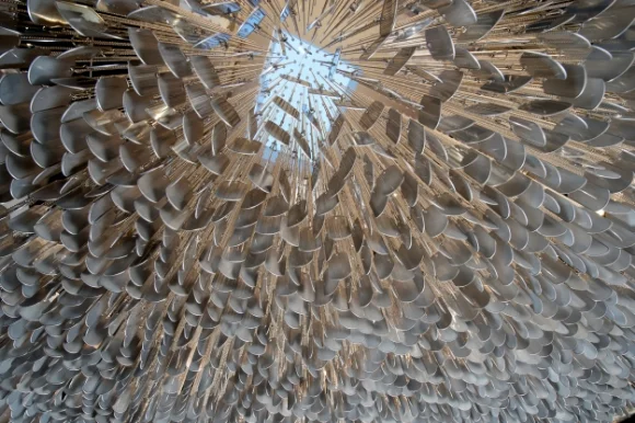 Thousands of dog tags comprise a chandelier at Dog Tag Bakery